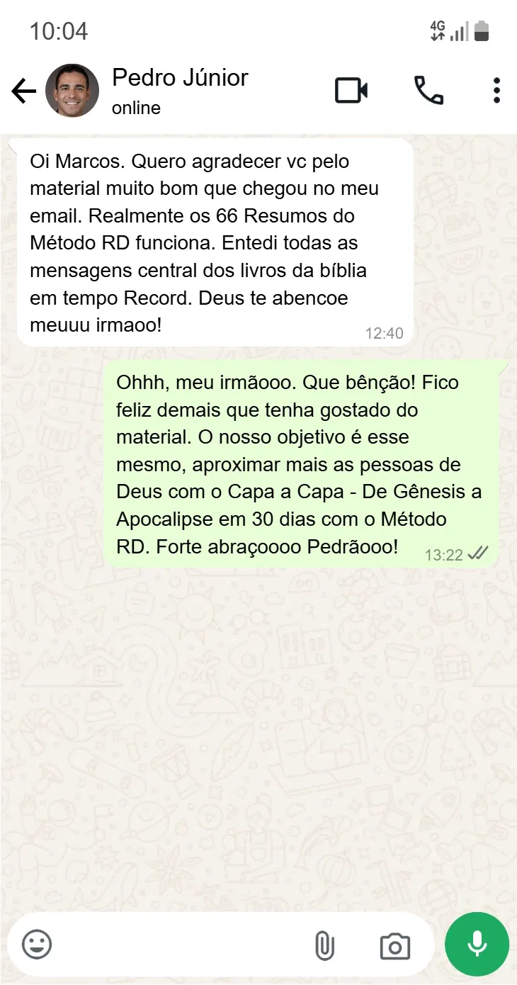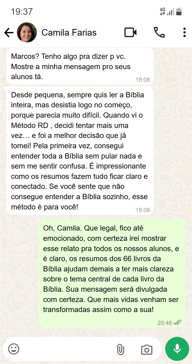 Foi então que decidi mudar isso. Comecei a estudar profundamente cada livro, buscando uma forma simples, organizada e acessível de compreender a Palavra de Deus de Gênesis a Apocalipse . E assim nasceu o Método RD – um sistema que resume os 66 livros da Bíblia em uma linguagem clara, sem termos complicados, e com um cronograma estratégico de 30 dias para que qualquer pessoa consiga entender toda a história da Bíblia sem se perder.